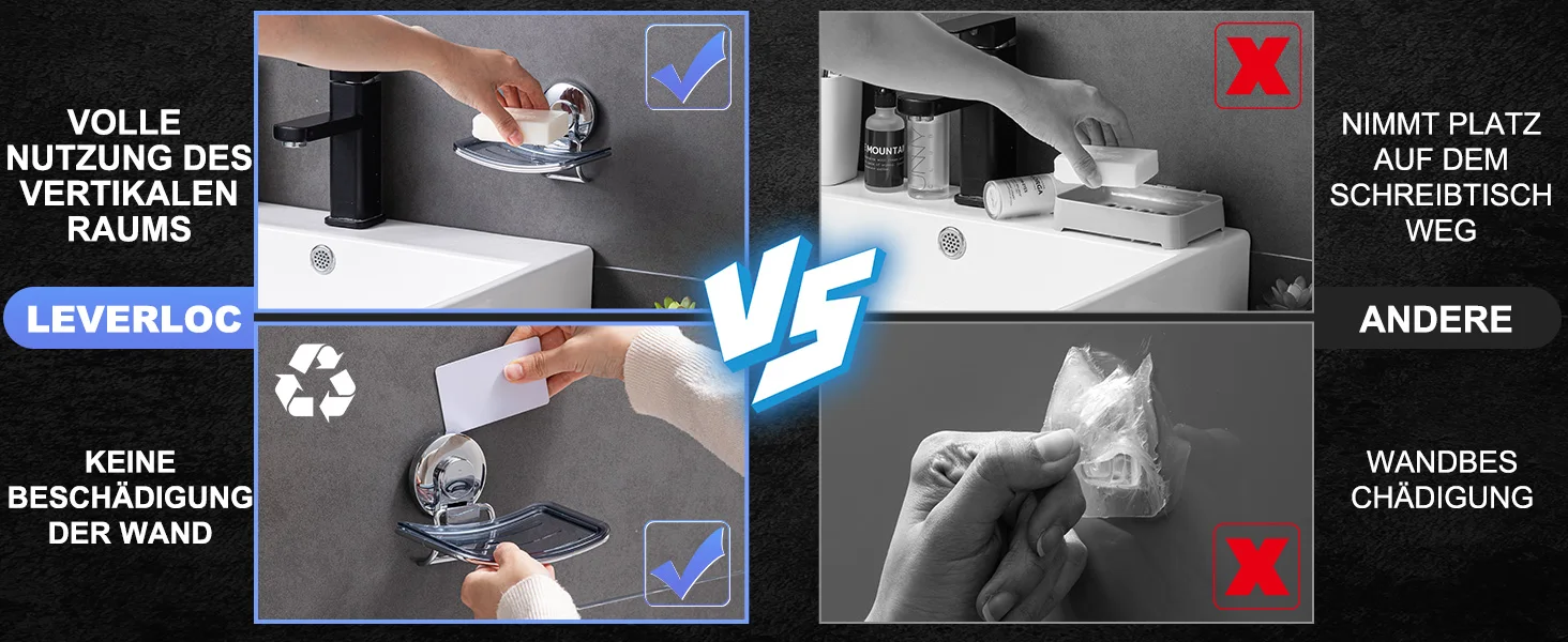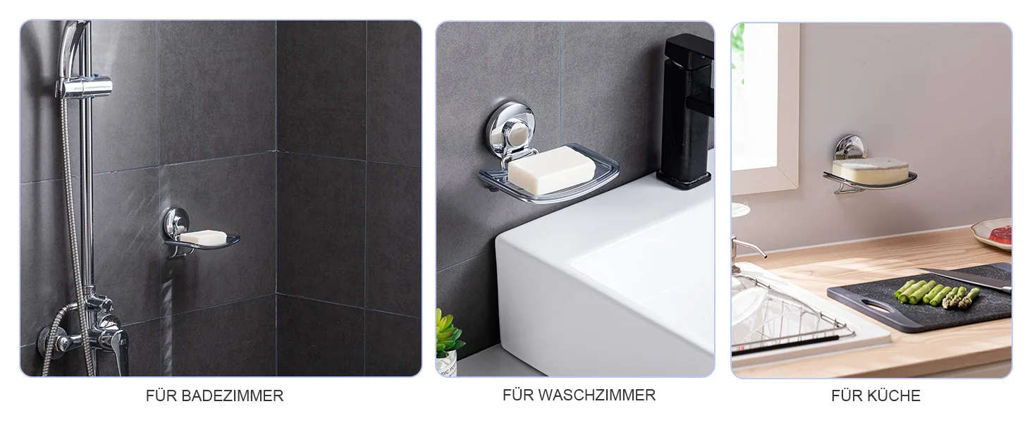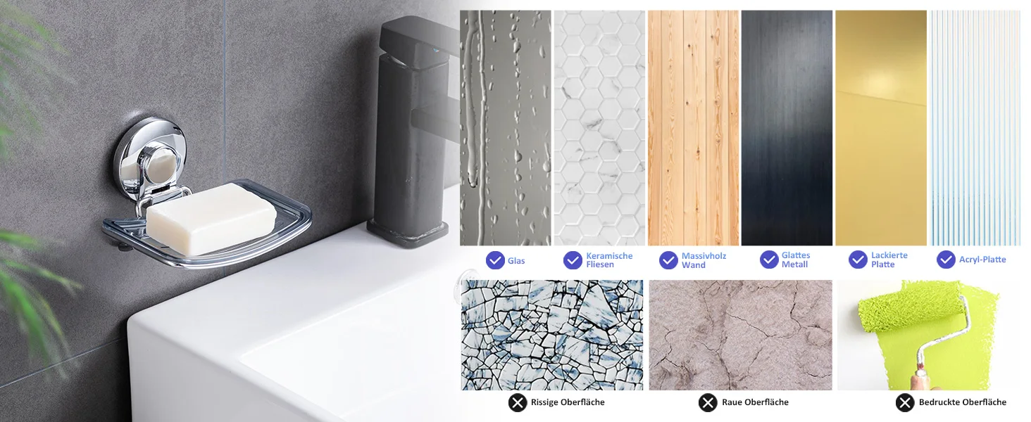 【Matters need Attention】: This suction cup soap dish works BEST on non-porous and smooth AIRTIGHT surfaces such as glass, mirror, polished metal, stainless steel, plastic board, wall tile, grainy granite, etc. Please remind that do NOT stick it on surfaces such as wood, unfinished marble, porcelain, wallpaper, natural stones, dry wall, cracked wall, etc.